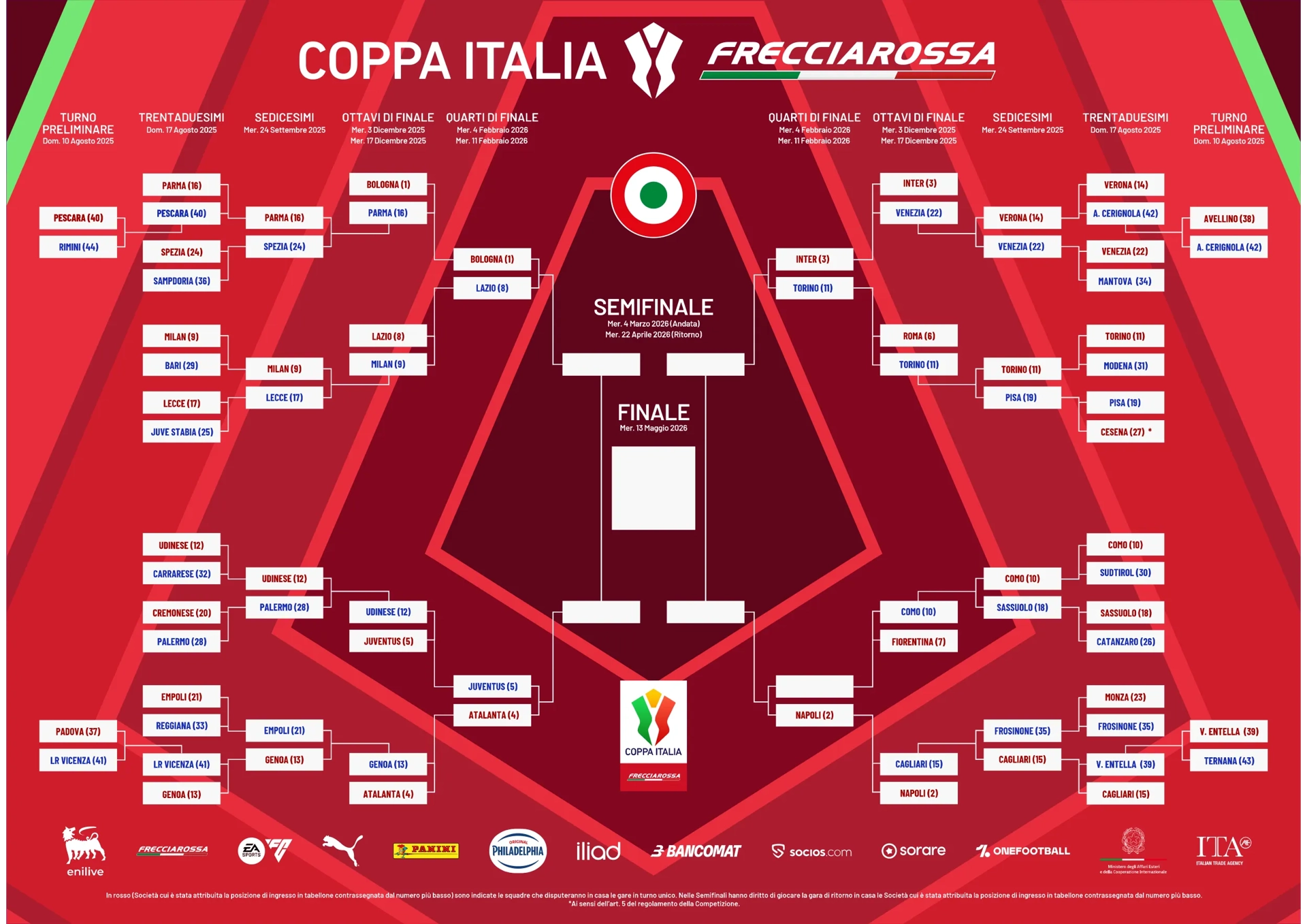 I nerazzurri si trovano nella parte destra del tabellone, nella metà superiore. Nella parte inferiore il Napoli ha eliminato il Cagliari ai calci di rigore e affronterà la vincente tra Fiorentina e Como.